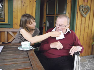 Es war im September 2014. Maria Pimmingsdorfer, vulgo „Knoglin in Pötting“, starb während eines fröhlichen Ausflugs. Ein Schock für die Familie, vor allem ihren Mann, den Sepp. Seine Augen wurden müde und sehen fast gar nichts mehr. Die Erinnerung zog sich ins Innere zurück. Reden kann er auch nur mehr ganz wenig. Die Freude ist aus dem Haus dennoch nicht verschwunden. Zwei Pflegerinnen aus Rumänien tragen dazu bei.