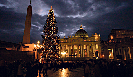 MENSCHEN_MEINUNGEN 10.12.2024 O Fichtenbaum DENK_WÜRDIG_ Allen Protesten zum Trotz wurde auch heuer ein Christbaum auf dem Petersplatz aufgestellt. Der Brauch geht auf das Jahr 1982 zurück.